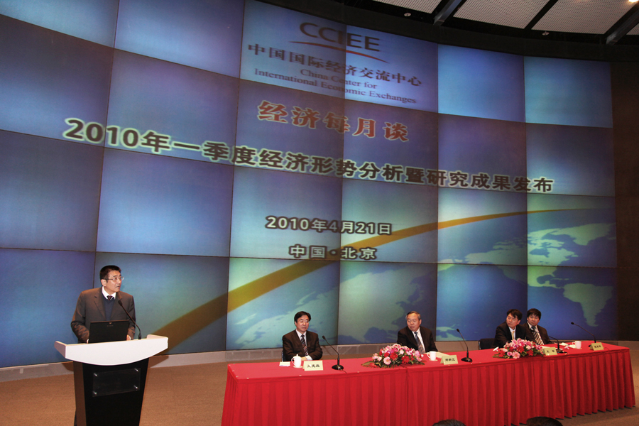 2010年4月21日上午,国经中心在中华世纪坛举办第九期“经济每月谈”活动。本次论坛主题是“2010年一季度经济形势分析暨研究成果发布”。论坛由国经中心研究部负责人主持,国经中心郑新立常务副理事长出席,并做了主题为“经济回升势头强劲,结构调整亟待加强—关于一季度经济形势分析”的演讲。