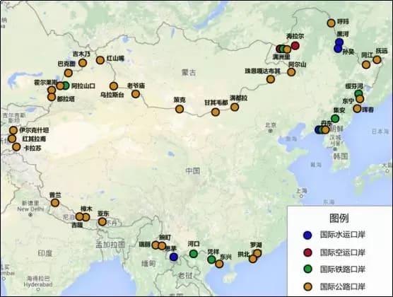 从地理方位上看,中国沿边省市大部分地区,正处在欧亚增长极交汇区域的核心地带,与“一带一路”相交相汇,边境口岸与周边国家对接相连。我国与周边国家的陆路边境线长达22800公里,与15个国家的领土接壤,开放口岸有285个,其中空运口岸63个,水运口岸139个,公路口岸64个,铁路口岸19个。此外,在“一带一路”上的其他各相邻国家,也有一些重要口岸,这些口岸可以成为“一带一路”的重要节点。
