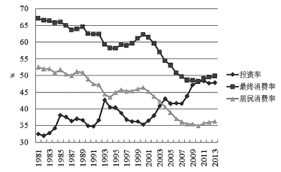 1981—2013年最终消费率、居民消费率、投资率变化情况(数据来源:中国统计年鉴2014)