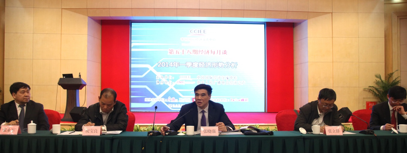 2014年4月22日上午,国经中心在北京梅地亚中心二层多功能厅举办第五十八期“经济每月谈”活动,主题为:“2014年一季度经济形势分析”,中国国际经济交流中心执行副理事长张晓强主持了本次活动。
