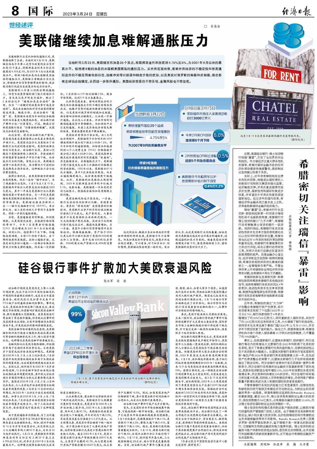 由于美欧通胀率仍然较高,为了应对通胀,这些国家(或货币区)的央行暂时还无法降息甚至还要继续加息。例如,欧洲中央银行16日召开货币政策会议,决定将欧元区三大关键利率均上调50个基点,自本月22日起开始执行。3月22日,美联储宣布将联邦基金利率目标区间上调25个基点至4.75%至5%之间,利率升至2007年9月以来最高水平。这种情况使得金融风险无法消除甚至继续加大。