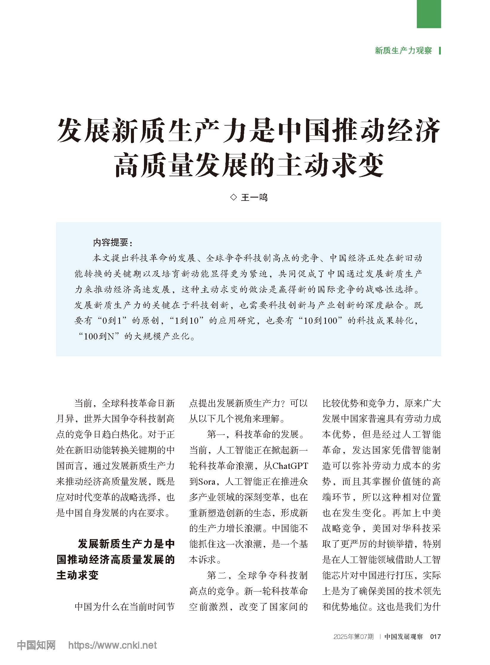 发展新质生产力是中国推动经济高质量发展的主动求变
