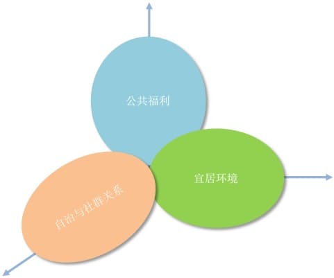社区的力量在于它是社区居民公共服务的保障者、生活服务的提供者、隐私安全的保护者、精神交流的沟通者。它要为居住者的休憩、生活和学习营造一个适宜的环境与空间。对于居民来讲,其在社区生活中最看重的是:①有安全感和归属感;②基本权益得到保障;③宜居环境与良好的邻里关系;④有利于年轻一代纵向流动。因此,在加强和改善社区管理的同时,要把握好公共福利、基于自治的社群关系和宜居环境三个最重要的维度(图6),推进管理型社区向社区治理转型。