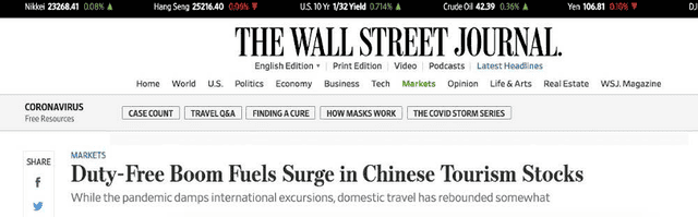 《华尔街日报》近日发表题为《免税热潮助推中国旅游业股票大涨》的文章指出,虽然新冠肺炎疫情影响国际旅游,但中国国内旅游热度有所回升,中国旅游业迅速回暖,并促进中国经济第二季度恢复增长。(来源:中国青年网官方帐号)