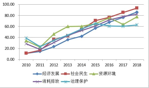图2 中国可持续发展指数一级指标走势(2010-2018)